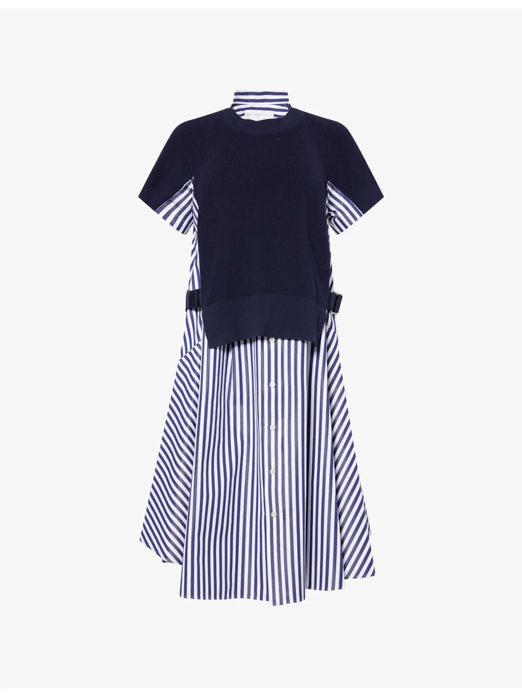 PRODUCT DETAILS - Sacai cotton-poplin maxi dress - 100% cotton; contrast 65% polyester, 35% cotton - Exposed button fastening at front - Regular fit, round-neck, raglan short sleeves, knitted at front and sleeves, belt loops, ribbed belt, straight yoke and pleat at back, flared hem - Dry clean - True to size - Size small: length 40in / 102cm - Model is 5ft 10in/1.78m and wears a size small - Lightweight, slight stretch Ref: R04568032