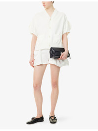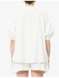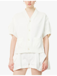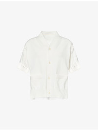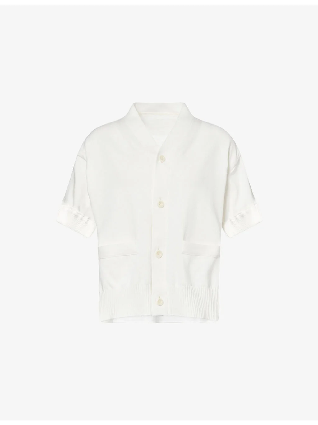PRODUCT DETAILS - Sacai cotton-blend cardigan - 54% cotton, 46% polyester; contrast 100% cotton - Exposed button fastening at front - Relaxed fit, V-neck, short sleeves, two welt pockets at front, knitted at front, contrast texture at back, ribbed trims - Dry clean - Made in Japan - True to size - Size small: length 22in / 56cm - Model is 5ft 10in/1.78m and wears a size small - Midweight, stretchy Ref: R04567713