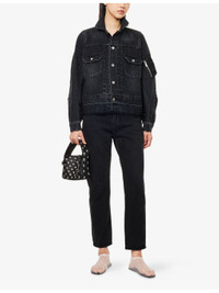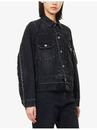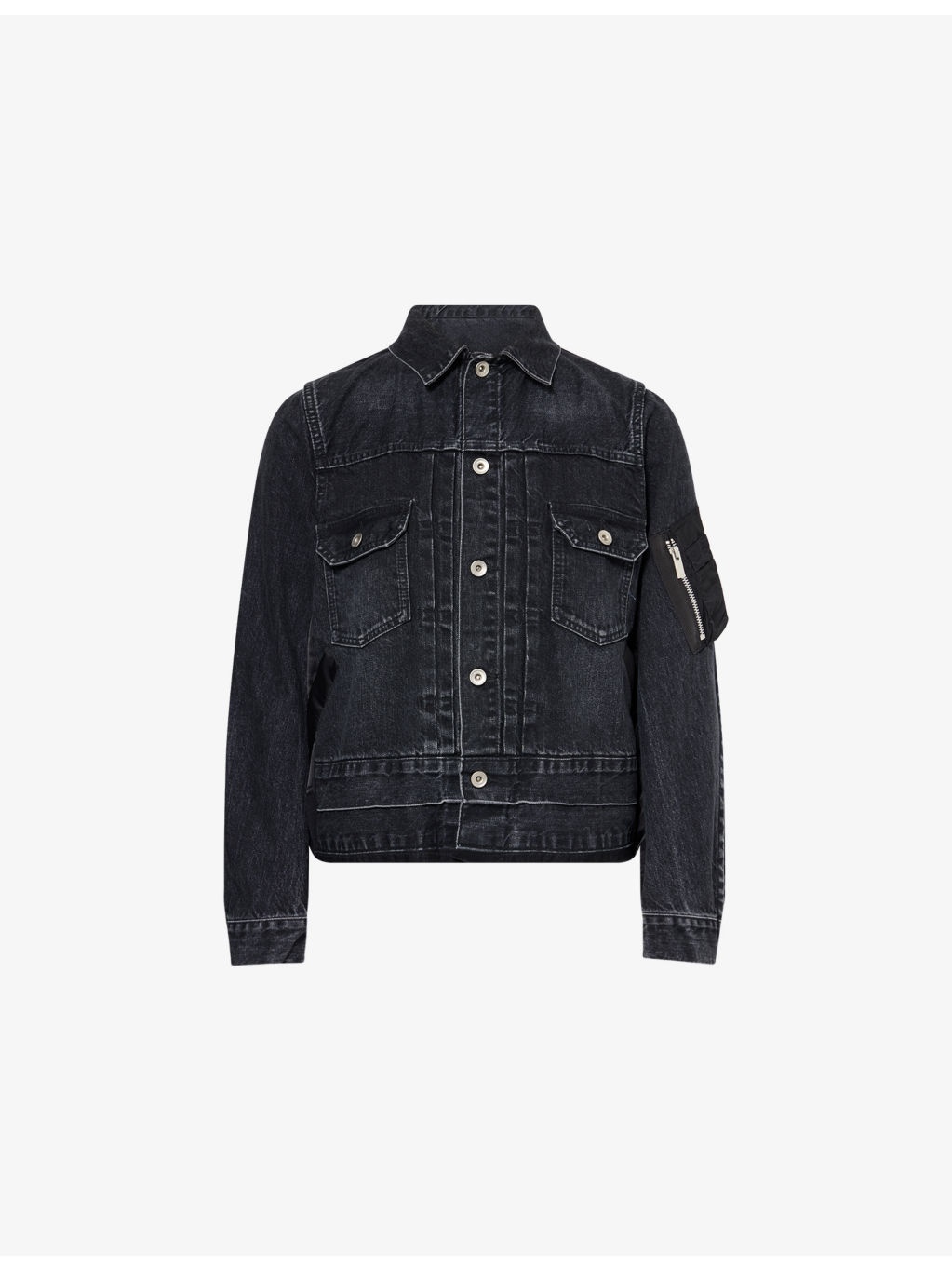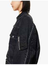 PRODUCT DETAILS - Sacai denim jacket - 100% cotton; contrast 100% nylon; filling 100% polyester; lining 100% cupro; trims 55% polyester, 44% cotton, 1% polyurethane - Exposed button fastening at front - Regular fit, spread collar, long sleeves, zip pocket at sleeve, four buttoned pockets and pleated at front, contrast shell texture at back, partially padded and lined, knitted trims, raw hem at front - Dry clean - Made in Japan - True to size - Size small: length 22in / 57cm - Model is 5ft 10in/1.78m and wears a size small - Lightweight, slight stretch Ref: R04488243