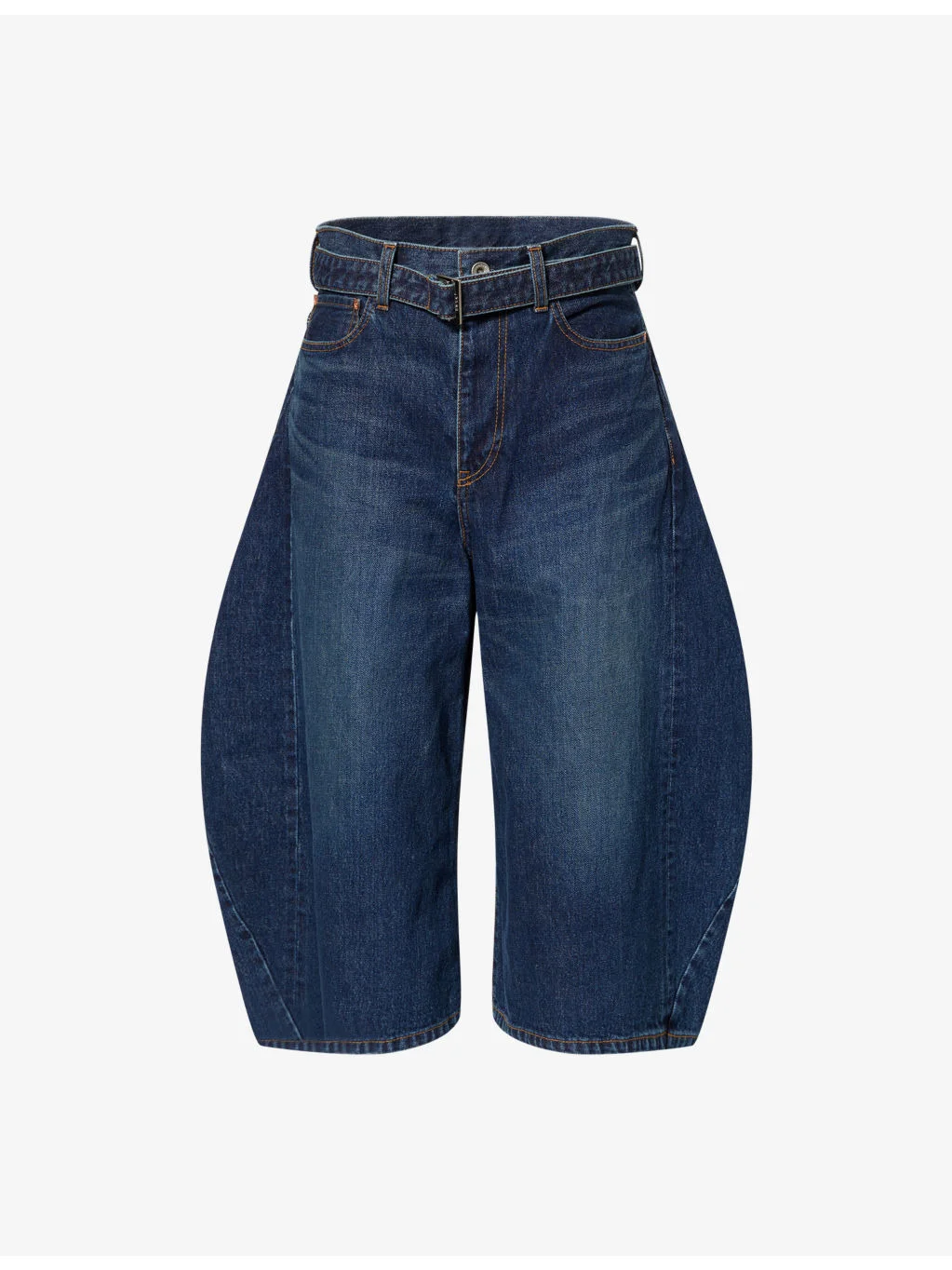 PRODUCT DETAILS - Sacai denim jeans - 100% cotton - Button and zip-fly fastening - High rise, low-crotch, cropped wide barrel-leg, five pockets, belt loops, removable adjustable belt, branded hardware, patch pocket at leg - Dry clean - Made in Japan - True to size - Size small: rise 13in / 33cm, inside leg 18.5in / 47cm, leg opening 26in / 66cm - Model is 5ft 10in/1.78m and wears a size small - Midweight, non-stretch Ref: R04567711