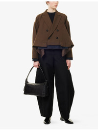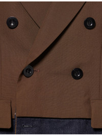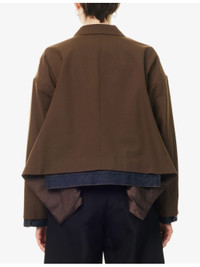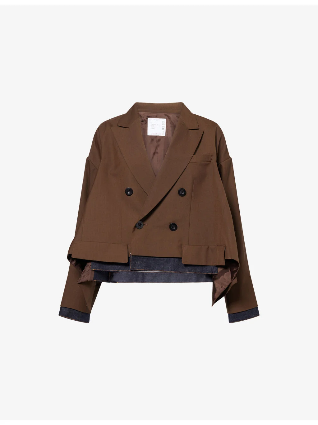 PRODUCT DETAILS - Sacai woven jacket - 70% polyester, 30% wool; contrast 100% cotton; lining 100% cupro - Exposed button fastening at front - Relaxed fit, double-breasted, notch lapels, long sleeves, buttoned cuffs, welt pocket at front, contrast denim texture at sides and trims, buttoned epaulette at sides, fully lined, asymmetric hem - Dry clean - Made in Japan - True to size - Size small: length 22in / 57cm - Model is 5ft 10in/1.78m and wears a size small - Midweight, slight stretch Ref: R04567697