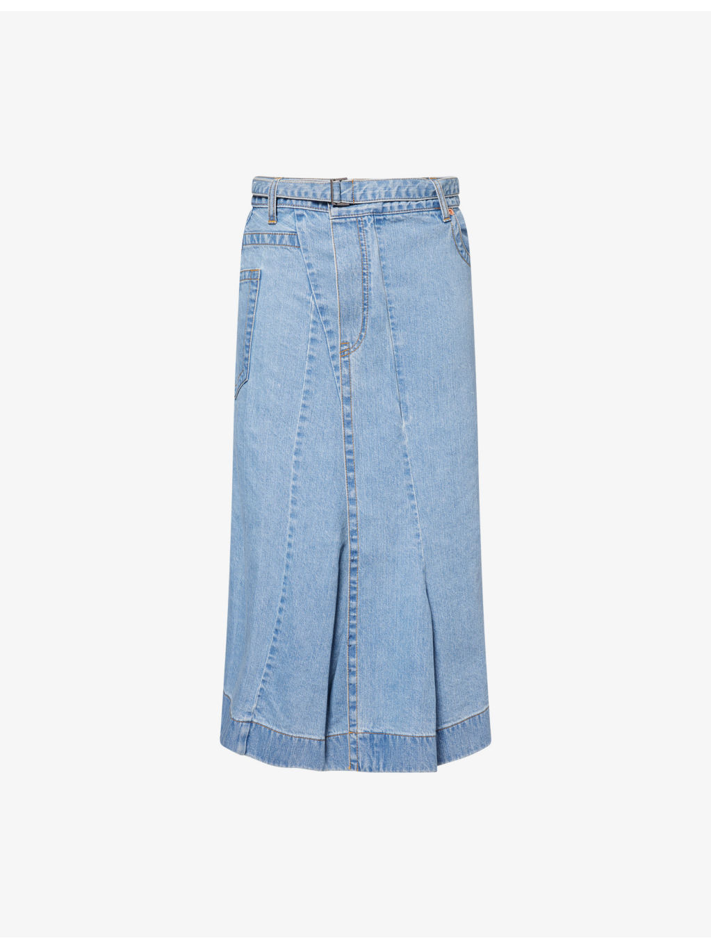 PRODUCT DETAILS - Sacai denim midi skirt - 100% cotton - Exposed button and concealed zip-fly fastening at front - Regular fit, high-waist, wrap front, detachable belt, asymmetric pockets, flared hem - Dry clean - Made in Japan - True to size - Size small: length 31in / 80cm - Model is 5ft 10in/1.78m and wears a size small - Midweight, slight stretch Ref: R04493474