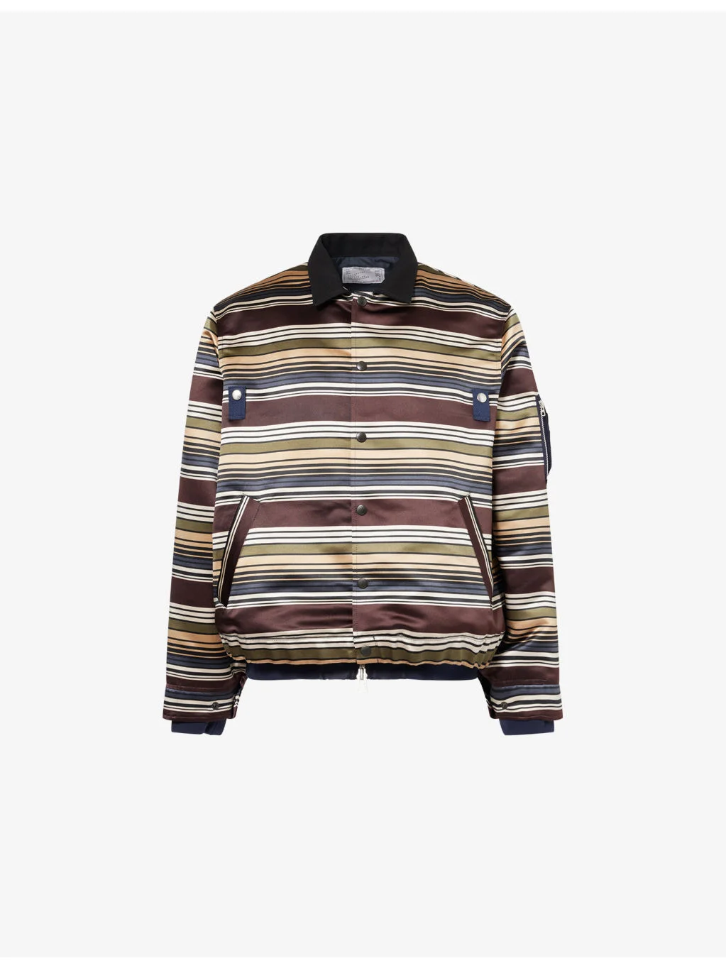 PRODUCT DETAILS - Sacai woven jacket - 100% polyester - Snap fastening - Relaxed fit, double layered bodice, contrast twill collar, long sleeves, striped pattern, front pockets, ribbed trims - Dry clean - Size medium: length 27in / 68cm, chest 23in / 116.84cm - Model is 6ft 2in/1.88m and wears a size medium - Midweight, non-stretch Ref: R04579385