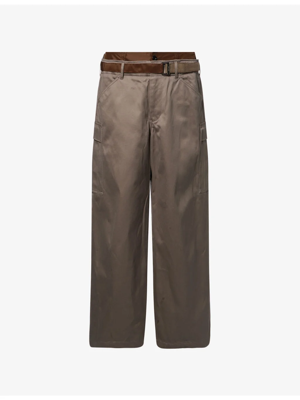 PRODUCT DETAILS - Sacai cotton and nylon trousers - 100% cotton; trims 100% nylon - Button and zip-fly fastening - Regular fit, wide leg, mid-rise, contrast layered waistband, two slip pockets and two patch pockets at sides, two slap pockets at back, removable adjustable belt at waist, adjustable drawstring cuffs - Dry clean - Made in Japan - Size medium: rise 14in / 35.5cm, inside leg 31in / 79cm, leg opening 24in / 61cm - Model is 6ft 2in/1.88m and wears a size large - Midweight, non-stretch Ref: R04579371