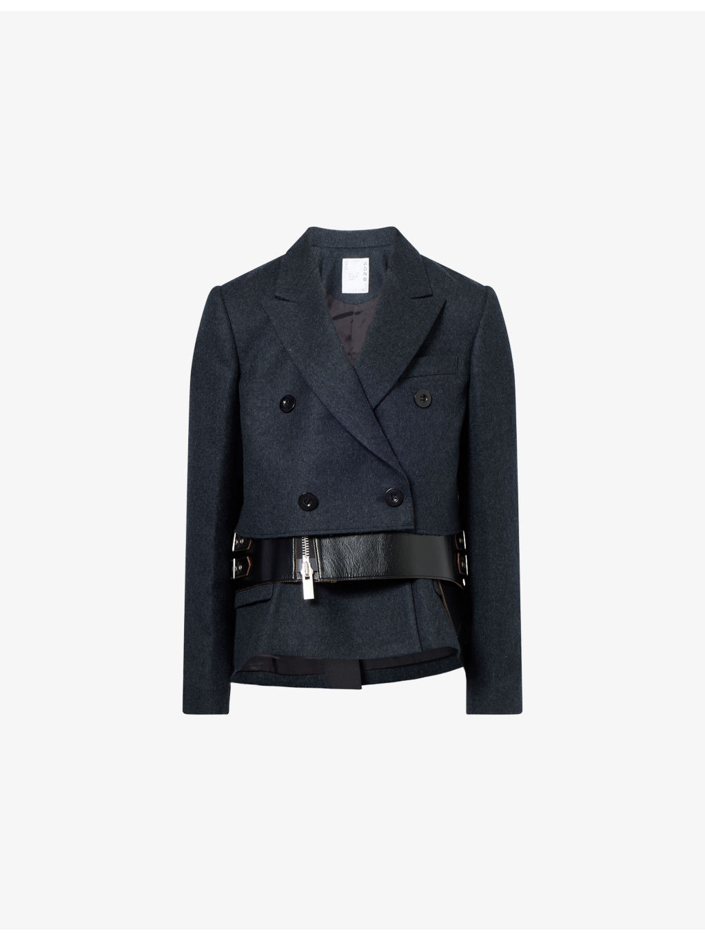 PRODUCT DETAILS - Sacai wool jacket - 100% wool; contrast 100% cowhide; lining 100% cupro - Exposed button and zip fastening at front - Regular fit, cropped, double-breasted, notch lapels, long sleeves, buttoned cuffs, welt pocket at front, contrast smooth leather panels, buckles at sides, fully lined, cut-out hem, flared asymmetric hem - Specialist leather clean - Made in Japan - True to size - Size small: length 23in / 59cm - Model is 5ft 10in/1.78m and wears a size small - Midweight, non-stretch Ref: R04519957