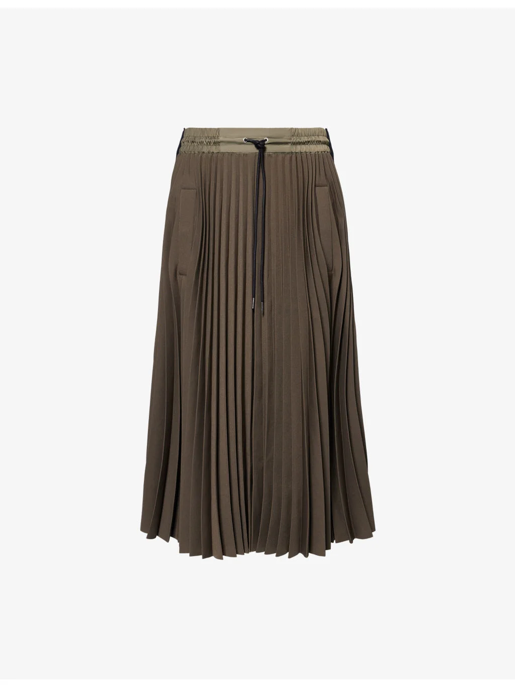 PRODUCT DETAILS - Sacai woven midi skirt - 100% polyester; contrast 100% polyester; lining 100% cupro - Regular fit, high-waist, contrast drawstring elasticated waistband, two buttoned pockets at front, contrast ribbed panel at sides, all-over pleated, partially lined - Dry clean - Made in Japan - True to size - Size small: length 32in / 83cm - Model is 5ft 10in/1.78m and wears a size small - Midweight, slight stretch Ref: R04568026