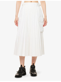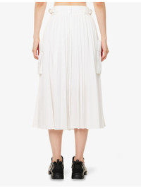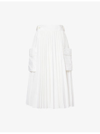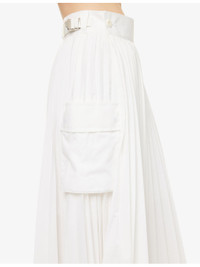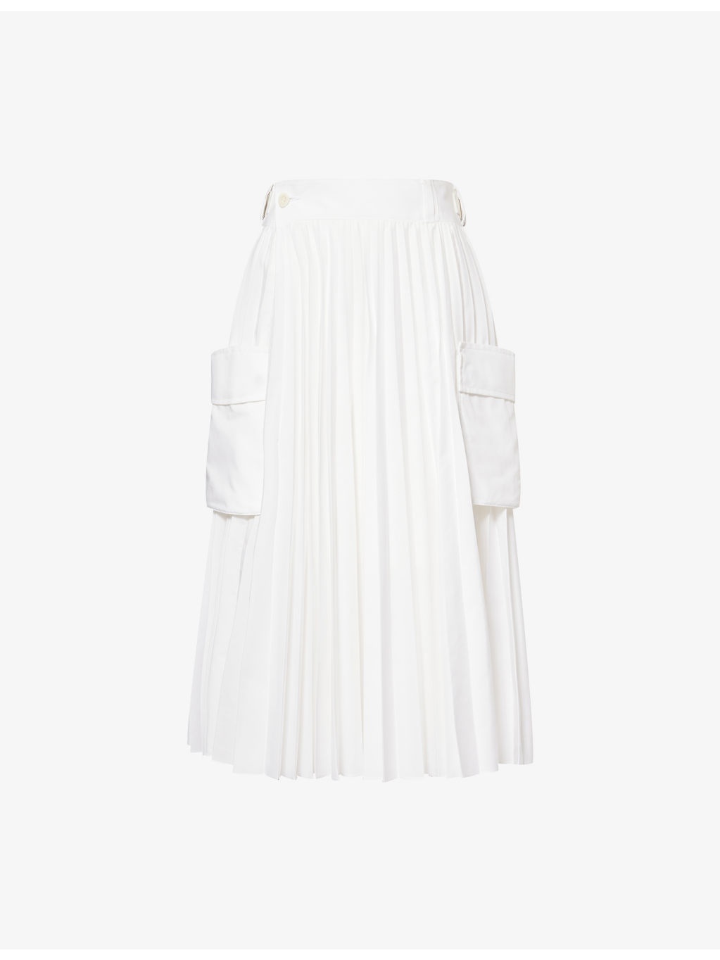 PRODUCT DETAILS - Sacai woven midi skirt - 65% polyester, 35% cotton; lining 100% cupro - Exposed and concealed button fastening at front - Regular fit, wrap front, belt loops, buckles at waistband, buttoned pocket at sides, all-over pleated, partially lined, flared hem - Dry clean - Made in Japan - True to size - Size small: length 31in / 80cm - Model is 5ft 10in/1.78m and wears a size small - Lightweight, stretchy Ref: R04488249