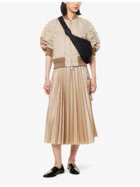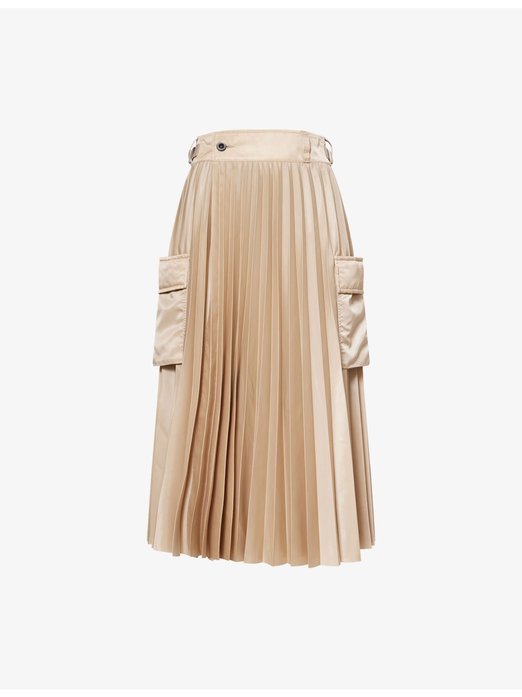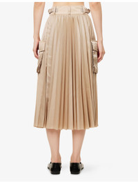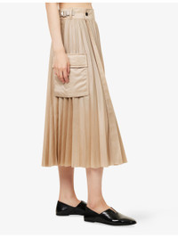 PRODUCT DETAILS - Sacai woven midi skirt - 100% polyester; filling 100% polyester; lining 100% cupro - Exposed button fastening at front - Regular fit, wrap front, belt loops, buckles at waistband, buttoned pocket at sides, all-over pleated, partially lined, flared hem - Dry clean - Made in Japan - True to size - Size small: length 31in / 80cm - Model is 5ft 10in/1.78m and wears a size small - Lightweight, stretchy Ref: R04488255