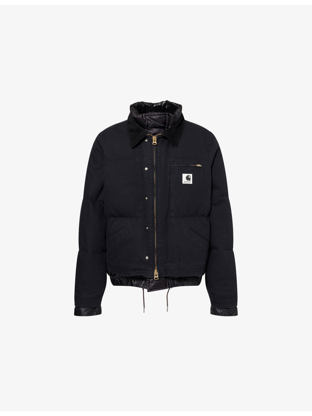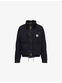 PRODUCT DETAILS - Sacai x Carhartt WIP canvas down jacket - 100% cotton; contrast 100% nylon; filling 90% duck down, 10% duck feather - Zip fastening - Regular fit, funnel neck, long sleeves, zip pocket at chest, logo patch at front, angled pockets at front, padded - Dry clean - Size medium: length 28in / 71cm, chest 50in / 127cm - Model is 6ft 2in/1.88m and wears a size medium - Heavyweight, non-stretch Ref: R04523472