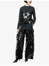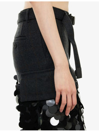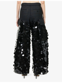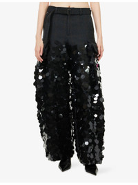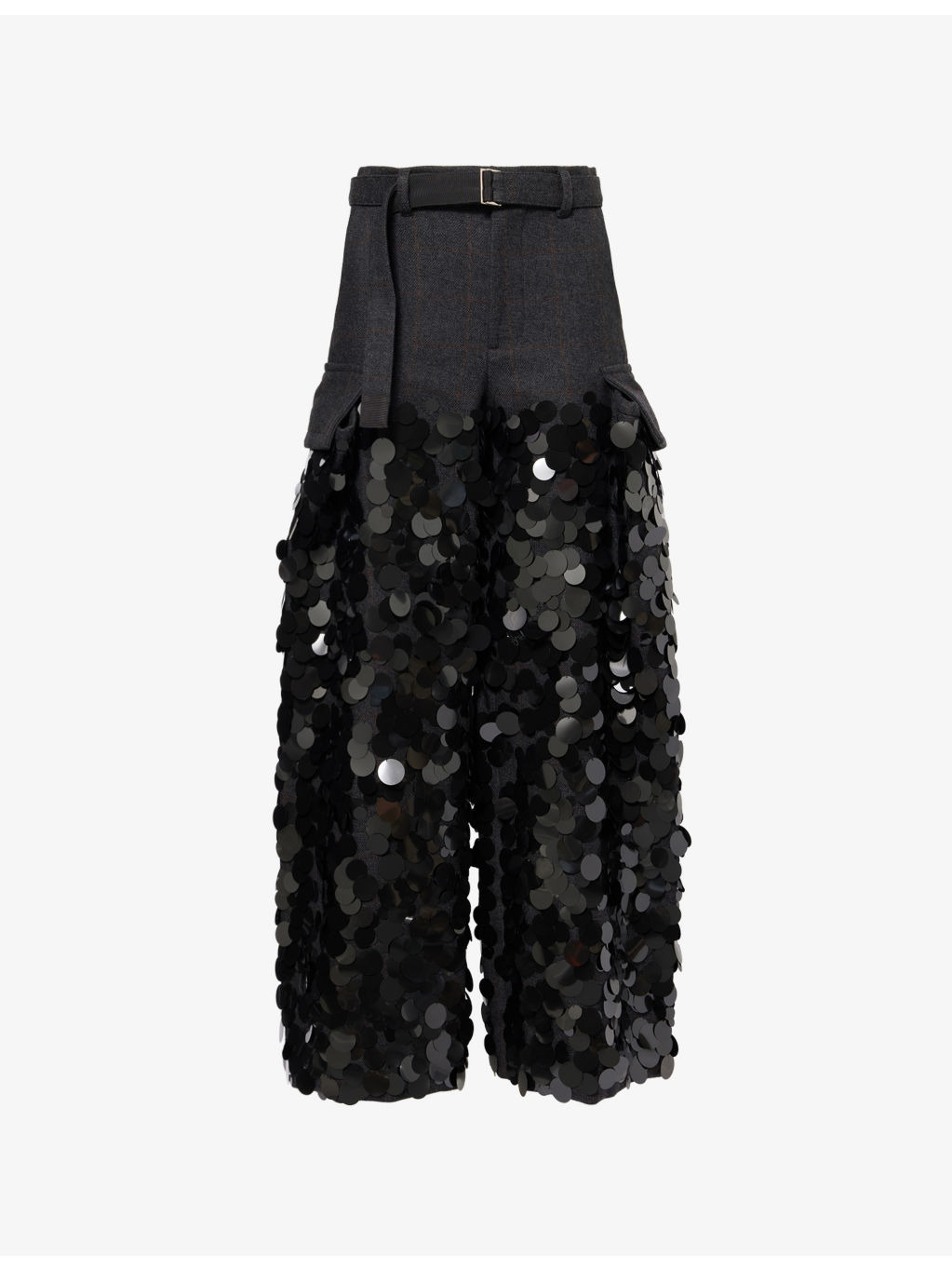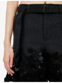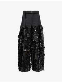 PRODUCT DETAILS - Sacai wool trousers - 100% wool; lining 100% cupro - Concealed button, hook-and-eye and zip-fly fastening at front - Relaxed fit, high-rise, wide leg, structured waistband with belt loops, detachable belt, two side slip pockets, two side flap pockets, two rear welt buttoned pockets, round sequin embellishments at leg - Specialist dry clean only - Made in Japan - True to size - Size small: rise 14in / 35.5cm, inside leg 29in / 74cm, leg opening 24in / 61cm - Model is 5ft 10in/1.78m and wears a size small - Heavyweight, non-stretch Ref: R04519956
