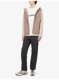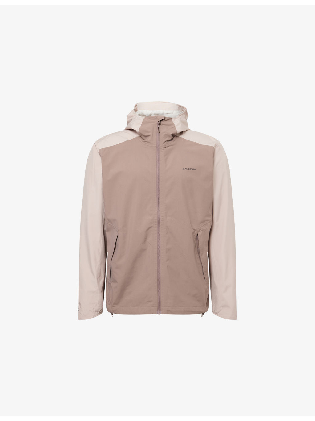 PRODUCT DETAILS - Salomon shell jacket - 100% polyester - Exposed zip fastening at front - Fixed hood, long sleeves, partially elasticated cuffs, two slanted zipped pockets at front, brand logo patch at chest, drawstring hem - Machine wash at 30°C - Size medium: length 29.1in / 74cm, chest 45.6in / 116cm - Model is 6ft 2in/1.88m and wears a size medium - Lightweight, non-stretch Ref: R04519130