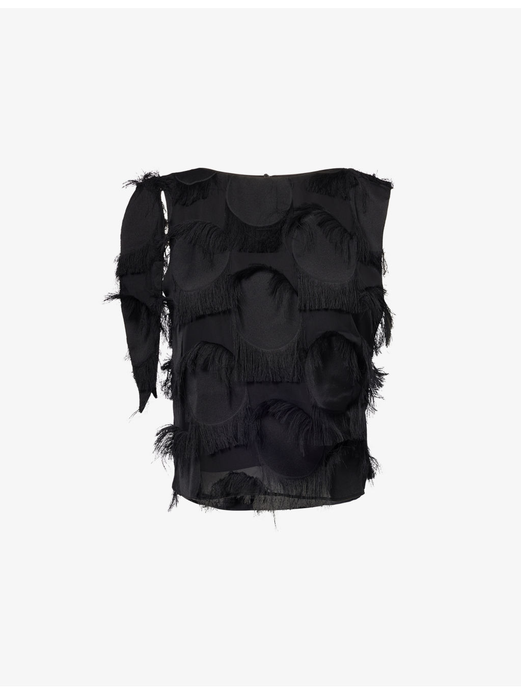 PRODUCT DETAILS - SamsOe & SamsOe woven top - 100% polyester - Exposed button fastening at back and concealed zip fastening at side - Regular fit, round neck, sleeveless, draped panel at side, all-over fringe applique - Hand wash - True to size - Size small: length 19in / 49cm - Model is 5ft 10in/1.78m and wears a size small - Lightweight, non-stretch Ref: R04487324