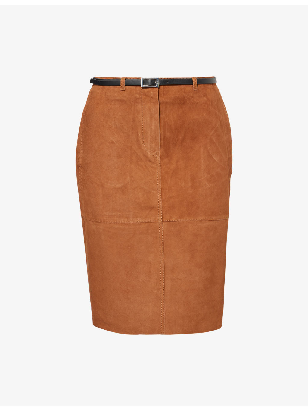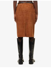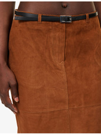 PRODUCT DETAILS - SamsOe & SamsOe leather-suede midi skirt - 100% leather - Concealed button, hook-and-eye and zip-fly fastenings at front - Regular fit, mid-rise, belt loops, matching belt, slit at back - Specialist leather clean - Made in India - True to size - Size small: length 22.5in / 57cm - Model is 5ft 10in/1.78m and wears a size small - Midweight, non-stretch Ref: R04487328