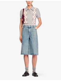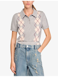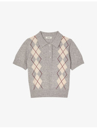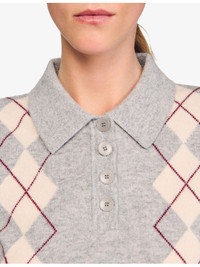 PRODUCT DETAILS - Sandro wool and cashmere-blend jumper - 90% wool, 10% cashmere - Exposed button fastening at front - Regular fit, polo collar, short sleeves, all-over argyle pattern, ribbed trims - Hand wash - True to size - Model is 5ft 9in/1.75m and wears a size UK 8 - Midweight, non-stretch Ref: R04501220