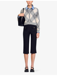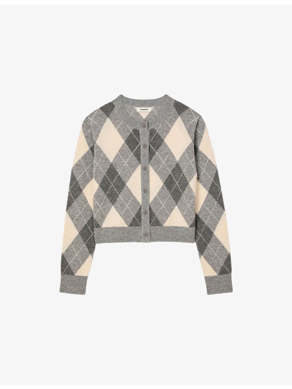 PRODUCT DETAILS - Sandro wool and cashmere-blend cardigan - 96% wool, 4% cashmere - Exposed button fastening at front - Regular fit, round neck, long sleeves, button-down design, all-over argyle pattern - Hand wash - True to size - Model is 5ft 9in/1.75m and wears a size UK 8 - Midweight, non-stretch Ref: R04502923