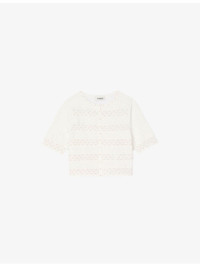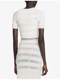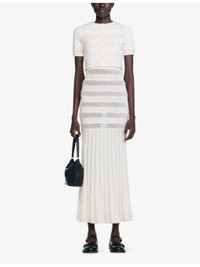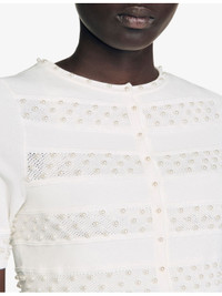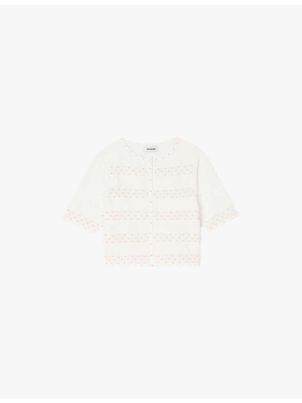 PRODUCT DETAILS - Sandro knitted cardigan - 83% viscose 17% polyester - 62% viscose, 20% polyamide, 15% polyester, 3% elastane - Button fastening - Curved neckline, short sleeves, all-over faux-pearl beaded striped design, cropped length - Hand wash - True to size - Lightweight, slight stretch Ref: R04490638