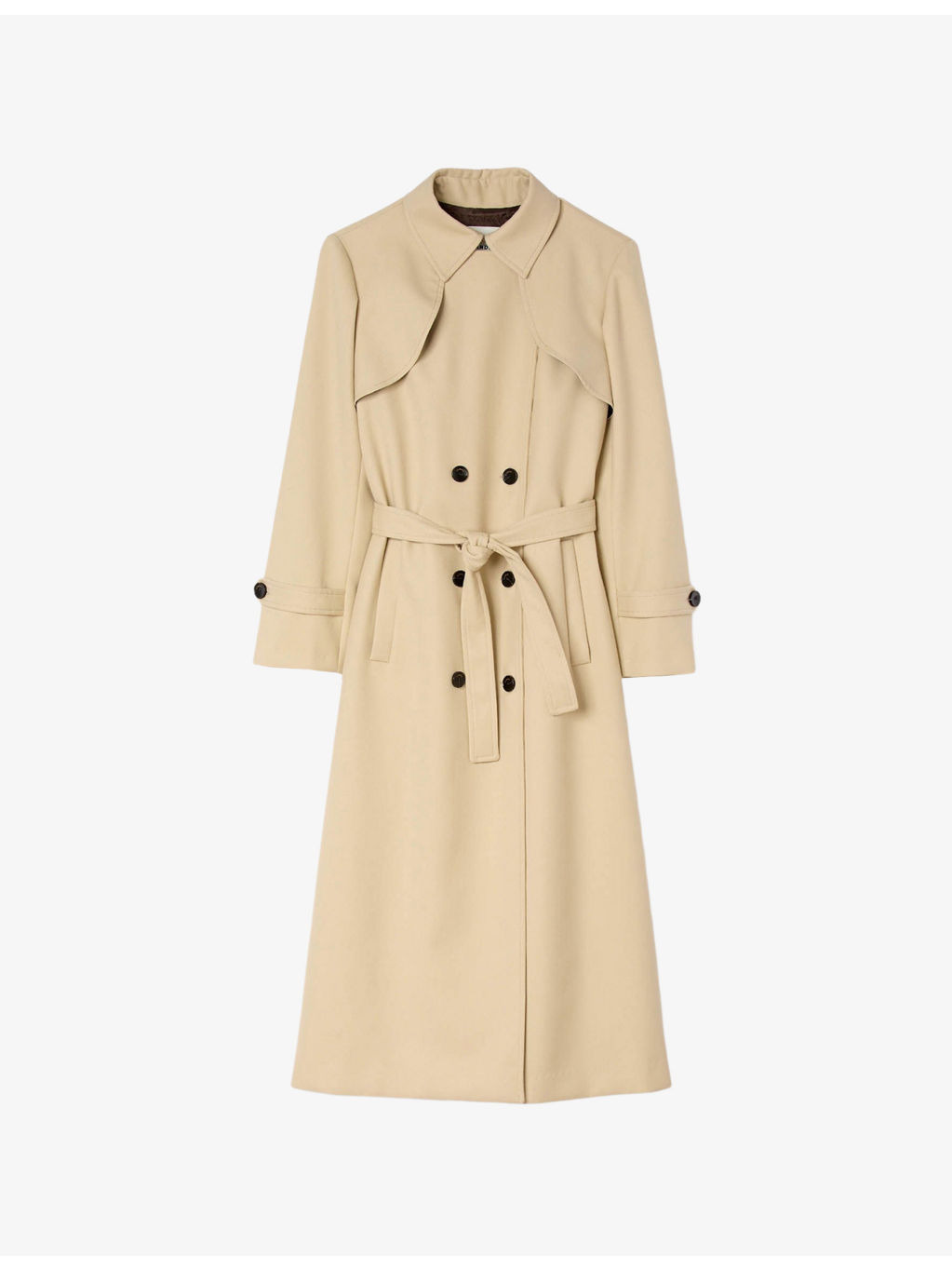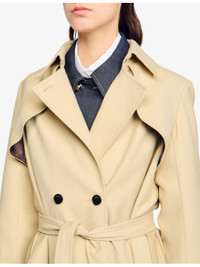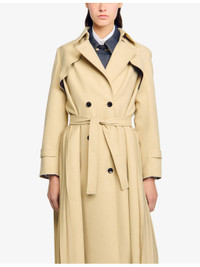 PRODUCT DETAILS - Sandro stretch-woven trench - 69% polyester, 30% viscose, 1% elastane - Exposed button fastening at front - Relaxed fit, lapel collar, long sleeves with buckled cuffs, belted at the waist, double-breasted silhouette - Dry clean - True to size - Model is 5ft 9in/1.75m and wears a size UK 8 - Midweight, slight stretch Ref: R04512056