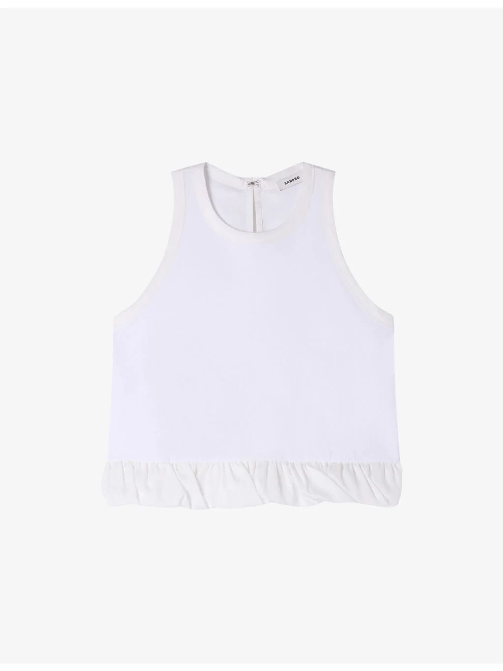 PRODUCT DETAILS - Sandro cotton top - 100% cotton - Self-tie fastening - Regular fit, round-neck, sleeveless, bow to back, ruffle hem - Machine wash mild - True to size - Model is 5ft 10in/1.78m and wears a size UK 8 - Lightweight, slight stretch Ref: R04598442