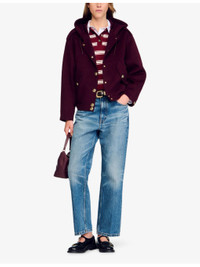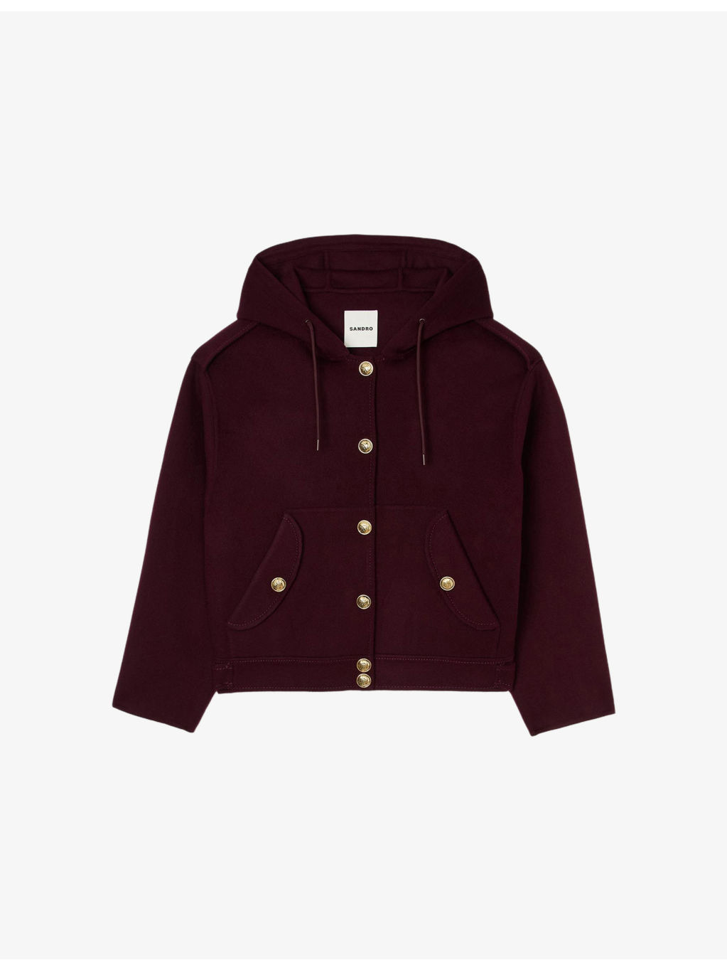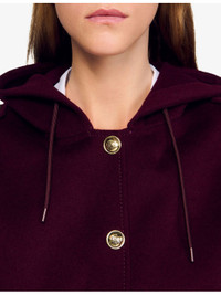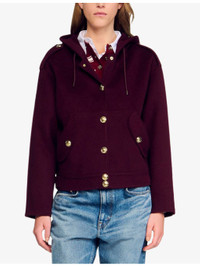 PRODUCT DETAILS - Sandro wool coat - 100% wool - Exposed button fastening at front - Relaxed fit, hooded, long sleeves, two buttoned pockets at the side, button-down design, gold-tone hardware, double face - Dry clean - True to size - Model is 5ft 10in/1.78m and wears a size UK 8 - Midweight, non-stretch Ref: R04320668