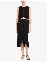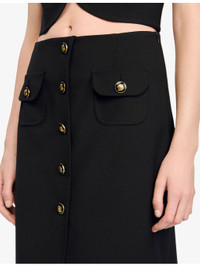 PRODUCT DETAILS - Sandro stretch-woven midi skirt - 91% polyester, 9% elastane - Exposed button fastening at front - Regular fit, high rise, two pockets at the side, button-down design, gold-tone hardware - Dry clean - True to size - Model is 5ft 10in/1.78m and wears a size UK 8 - Midweight, slight stretch Ref: R04490558