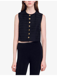 PRODUCT DETAILS - Sandro cotton-blend top - 85% cotton, 15% polyester - Exposed button fastening at front - Regular fit, round neck, sleeveless, button embellishment, all-over pleated finish, gold-tone hardware - Dry clean - True to size - Model is 5ft 9in/1.75m and wears a size UK 8 - Lightweight, non-stretch Ref: R04424560