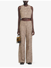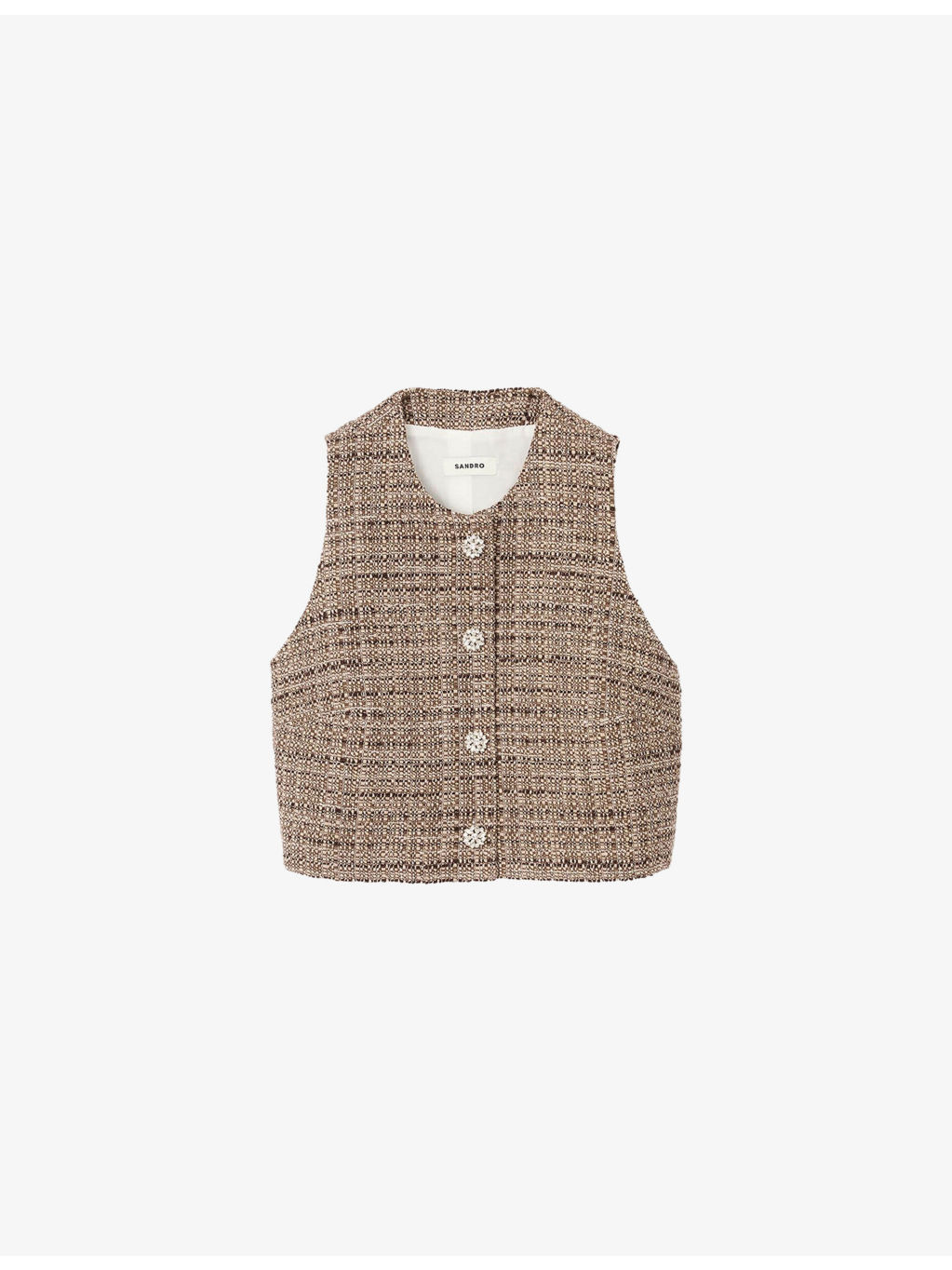 PRODUCT DETAILS - Sandro tweed vest - 48% cotton, 27% acrylic, 12% polyamide, 10% polyester, 3% other fibres - Exposed button fastening at front - Regular fit, round neck, sleeveless, button-down design, cropped - Dry clean - True to size - Model is 5ft 9in/1.75m and wears a size UK 8 - Midweight, non-stretch Ref: R04501228