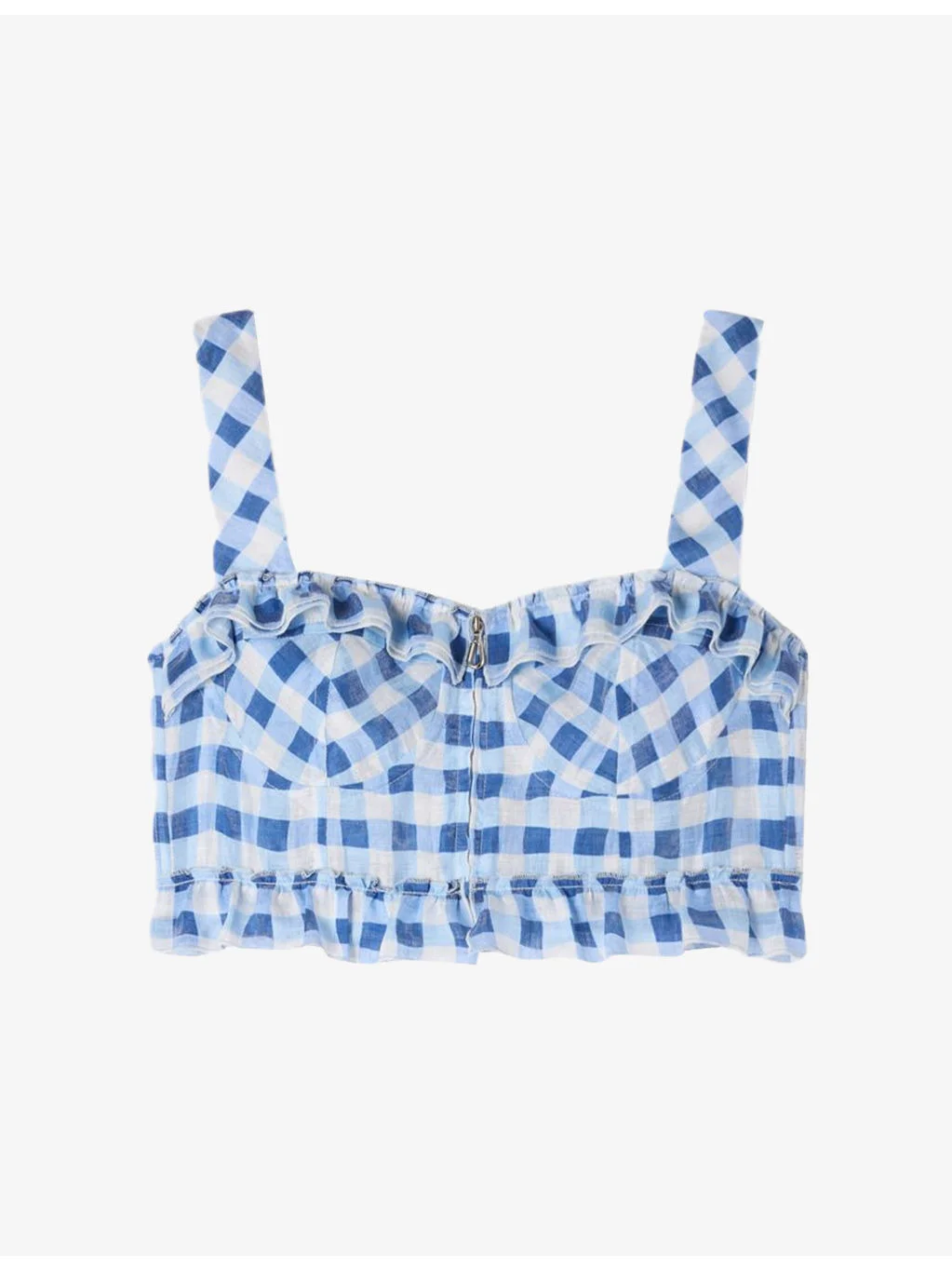 PRODUCT DETAILS - Sandro linen-blend top - 86% linen, 14% polyester - Exposed zip fastening at front - Slim fit, sweetheart neck, wide shoulder straps, all-over gingham checked pattern, frilled trims, cropped hem - Machine wash cold - True to size - Lightweight, non-stretch Ref: R04598481