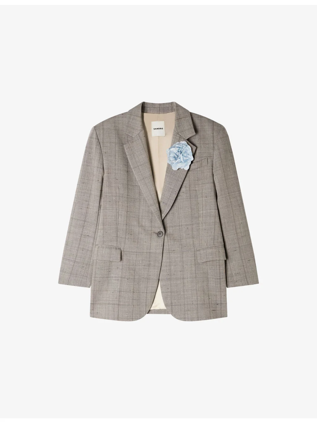 PRODUCT DETAILS - Sandro wool-blend jacket - 90% wool, 10% viscose - Button fastening - Relaxed fit, notch lapels, single-breasted, long sleeves, side pockets, flower brooch embellishment, all-over checked pattern - Dry clean - True to size - Model is 5ft 11in/1.80m and wears a size UK 8 - Midweight, non-stretch Ref: R04578781