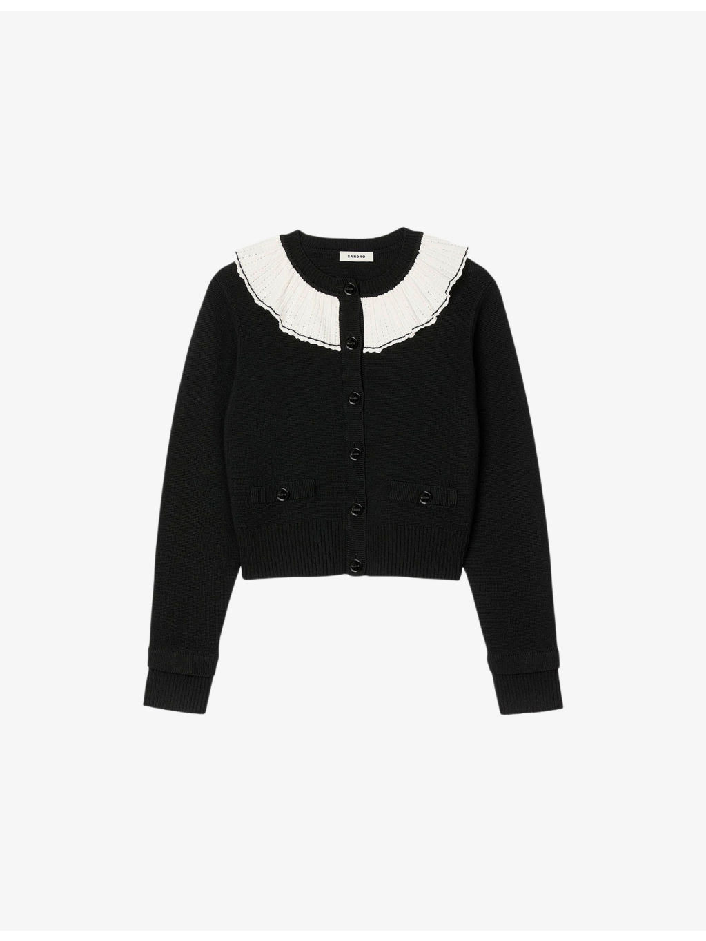 PRODUCT DETAILS - Sandro knitted cardigan - 48% acrylic, 46% wool, 6% polyamide - Exposed button fastening at front - Regular fit, contrast collar, long sleeves, two buttoned welt pockets at the side - Hand wash - True to size - Model is 5ft 9in/1.75m and wears a size UK 8 - Lightweight, non-stretch Ref: R04490633