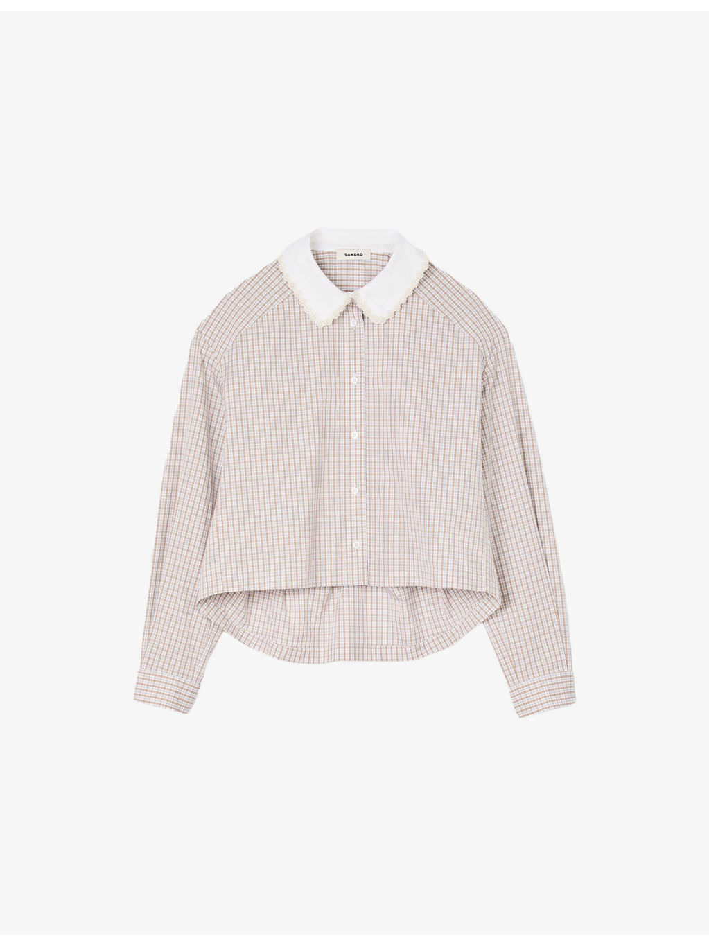 PRODUCT DETAILS - Sandro cotton shirt - 100% cotton - Exposed button fastening at front - Regular fit, contrast collar with frill edge, long sleeves, all-over checked pattern - Dry clean - True to size - Model is 5ft 9in/1.75m and wears a size UK 8 - Lightweight, non-stretch Ref: R04501199