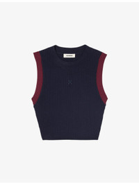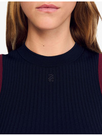 PRODUCT DETAILS - Sandro stretch-knit top - 49% viscose, 49% polyamide, 2% elastane - Slim fit, round neck, sleeveless, contrasting trim to armholes, all-over ribbed knit, monogram embellishment at chest, cropped hem - Hand wash - True to size - Model is 5ft 9in/1.75m and wears a size UK 8 - Lightweight, slight stretch Ref: R04490629