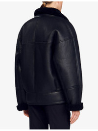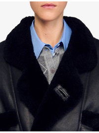 PRODUCT DETAILS - Sandro shearling coat - 100% lambskin leather - Exposed button fastening at front - Short silhouette, contrast collar, long sleeves, two pockets at the side - Specialist leather clean - True to size - Model is 5ft 9in/1.75m and wears a size UK 8 - Heavyweight, non-stretch Ref: R04501193