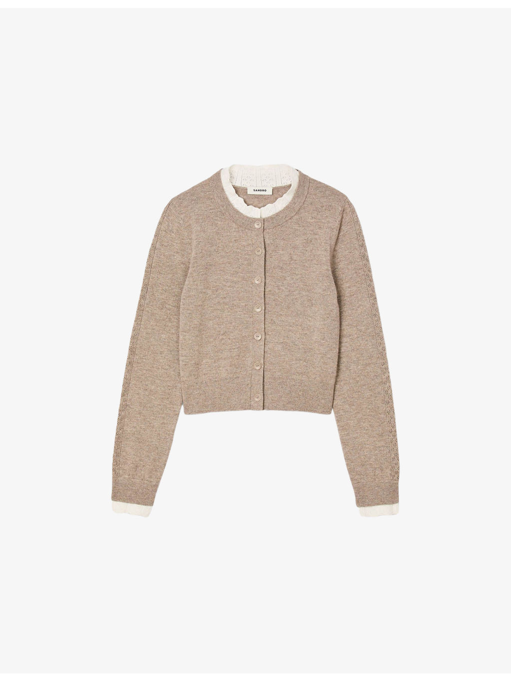 PRODUCT DETAILS - Sandro wool and cashmere cardigan - 90% wool, 10% cashmere - Button fastening - Regular fit, round-neck, long sleeves, contrast scalloped trim - Hand wash - True to size - Model is 5ft 9in/1.75m and wears a size UK 8 - Midweight, slight stretch Ref: R04501156