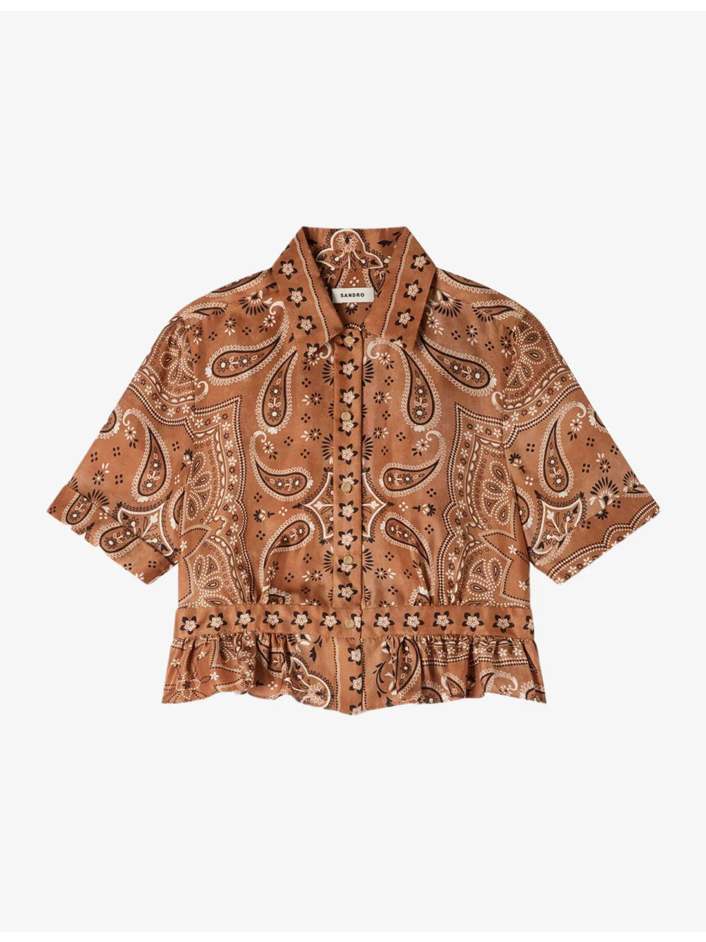 PRODUCT DETAILS - Sandro woven shirt - 100% viscose - Exposed button fastening at front - Regular fit, collared, short sleeves, all-over bandana print, ruffle hem - Dry clean - True to size - Model is 5ft 9in/1.75m and wears a size UK 8 - Lightweight, non-stretch Ref: R04598573