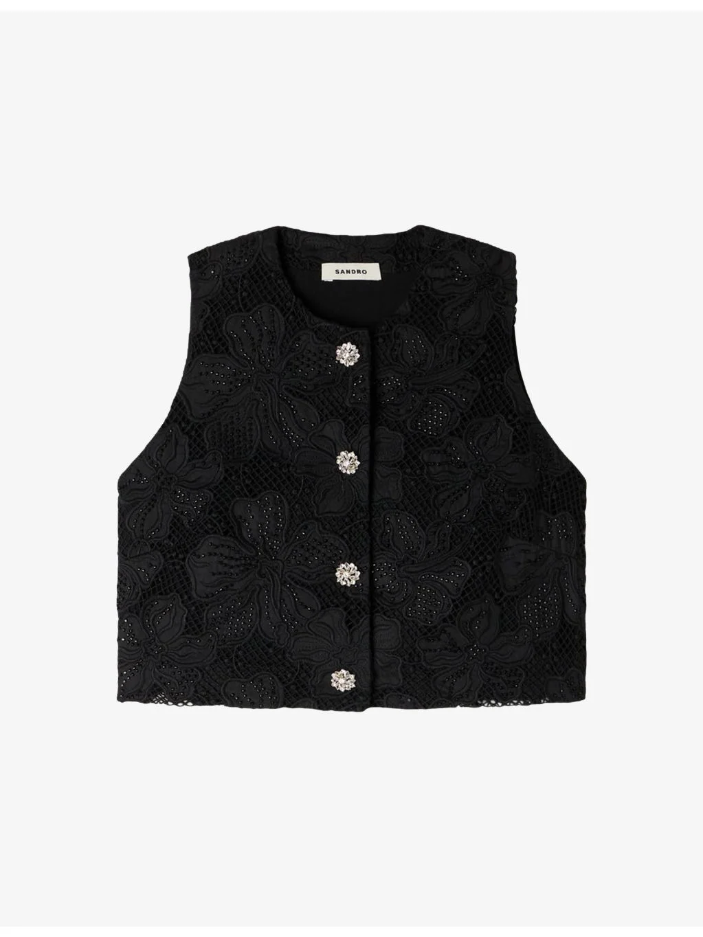 PRODUCT DETAILS - Sandro woven top - 68% polyester, 30% cotton, 2% polyamide - Exposed button fastening at front - Regular fit, round neck, sleeveless, all-over flower embroidery, jewelled hardware, cropped - Dry clean - True to size - Model is 5ft 9in/1.75m and wears a size UK 8 - Midweight, non-stretch Ref: R04598483