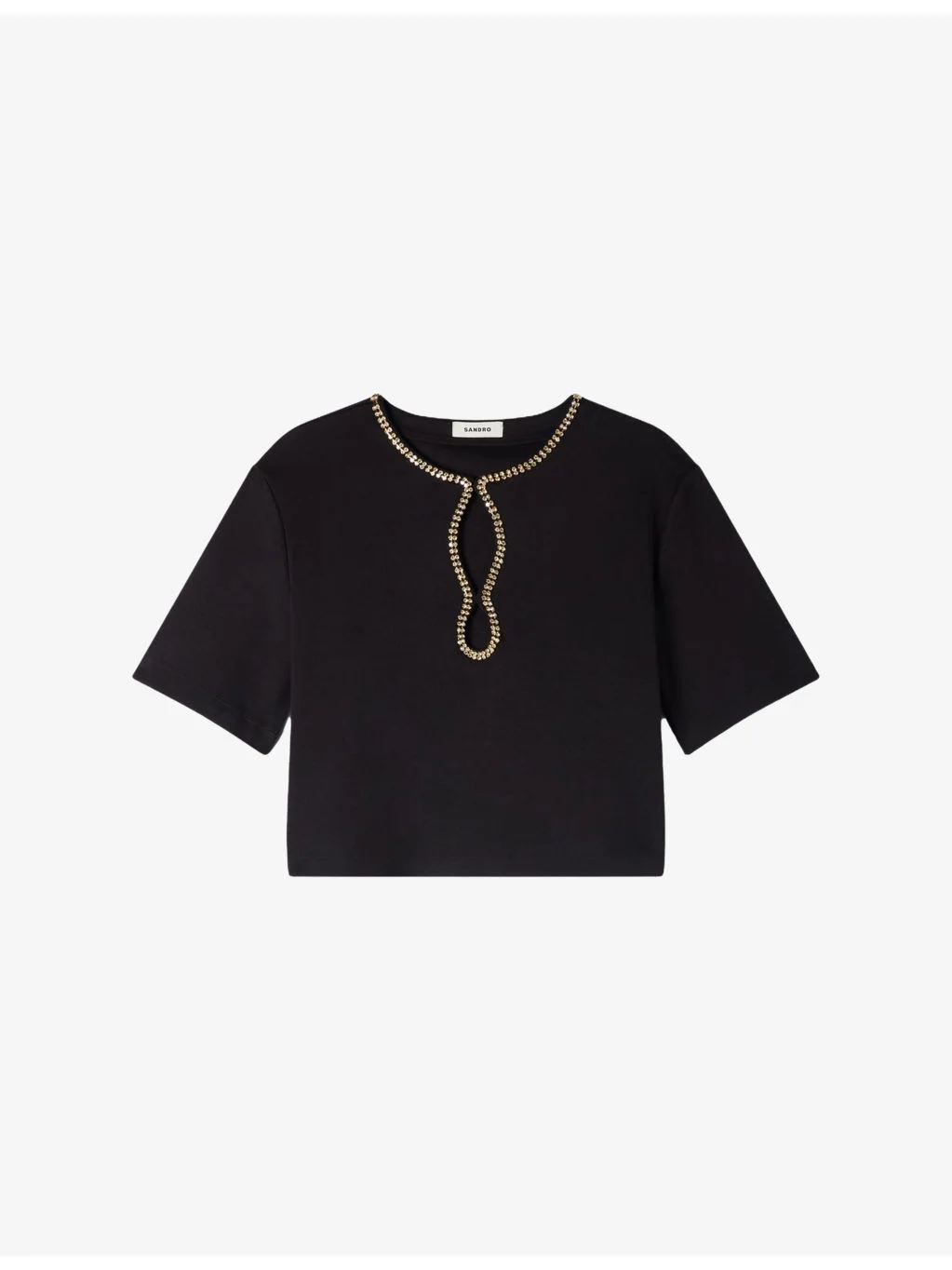 PRODUCT DETAILS - Sandro cotton-blend T-shirt - 58% cotton 42% polyester - Concealed button fastenings at front - Boxy cropped fit, round neck, cut-out detail at the front with rhinestone embellishment, short sleeves - Hand wash - True to size - Model is 5ft 8in /1.73m and wears a size 8 - Lightweight, non-stretch Ref: R04598300