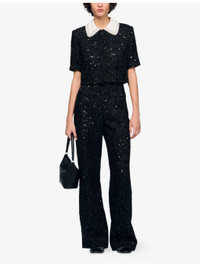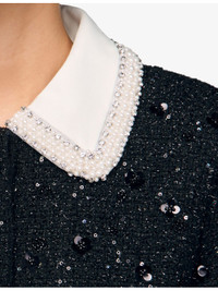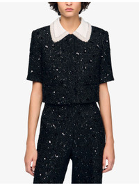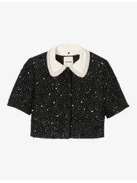 PRODUCT DETAILS - Sandro tweed jacket - 100% polyester - Exposed button fastening at front - Regular fit, beaded contrast collar, long sleeves, rhinestone embellishment, cropped - Hand wash - True to size - Model is 5ft 9in/1.75m and wears a size UK 8 - Midweight, non-stretch Ref: R04512070
