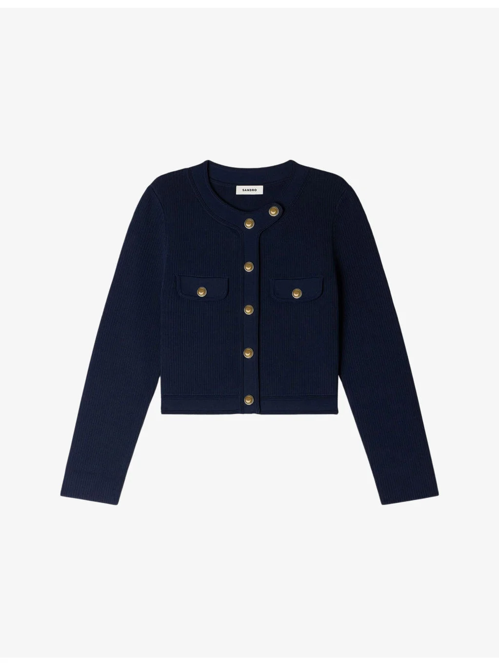 PRODUCT DETAILS - Sandro knitted cardigan - 60% viscose, 39% polyamide, 1% elastane - Pressed stud fastening - Regular fit, round-neck, long sleeves, chest pockets, ribbed texture, cropped - Hand wash - True to size - Model is 5ft 10in/1.78m and wears a size UK 8 - Midweight, slight stretch Ref: R04578709