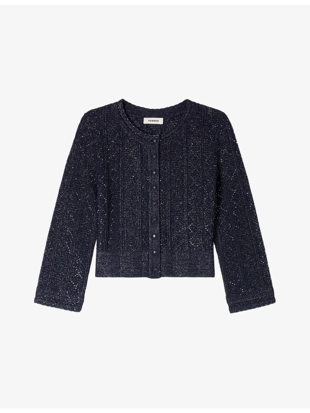 PRODUCT DETAILS - Sandro knitted cardigan - 69% viscose, 17% polyamide, 9% polyester, 5% metallic fibres; collar 58% viscose, 28% polyamide, 8% polyester, 4% metallic fibres, 2% elastane; rib 69% viscose, 17% polyamide, 9% polyester, 5% metallic fibres - Exposed button fastening at front - Regular fit, round neck, three-quarter length sleeves, rhinestone-embellished textured knit, cropped - Hand wash - True to size - Lightweight, slight stretch Ref: R04578699