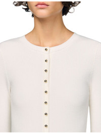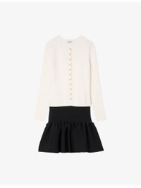 PRODUCT DETAILS - Sandro stretch-knit dress - 41% acrylic, 41% wool, 16% polyamide, 2% elastane - Exposed button fastening at front - Slim fit, round neck, long sleeves, button placket at the front, two-tone mini skirt - Hand wash - True to size - Model is 5ft 9in/1.75m and wears a size UK 8 - Midweight, non-stretch Ref: R04501124