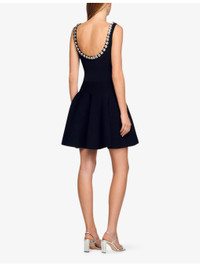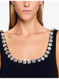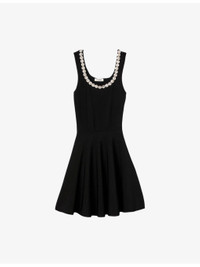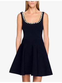 PRODUCT DETAILS - Sandro knitted mini dress - 63% viscose, 37% polyamide - Regular fit, scoop neck, crystal embellishment, sleeveless, flared skirt - Hand wash - True to size - Model is 5ft 10in/1.78m and wears a size UK 8 - Lightweight, slight stretch Ref: R04501232