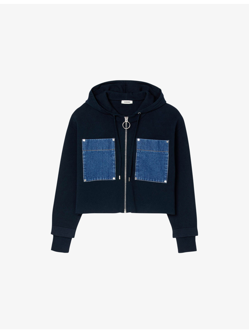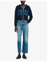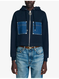 PRODUCT DETAILS - Sandro knitted hoody - 61% viscose, 25% polyester, 14% polyamide; pocket 100% cotton - Exposed zip fastening at front - Relaxed fit, round neck, drawstring hood, long sleeves, dropped shoulders, all-over knitted, two contrasting denim patch pockets at chest, metal rivets at pockets, ribbed trim to collar and cuffs - Hand wash - True to size - Midweight, non-stretch Ref: R04490587