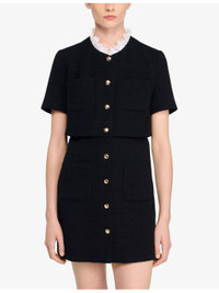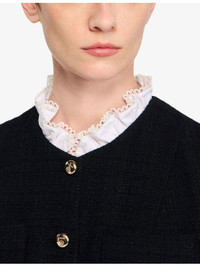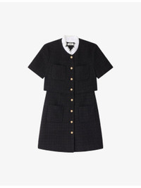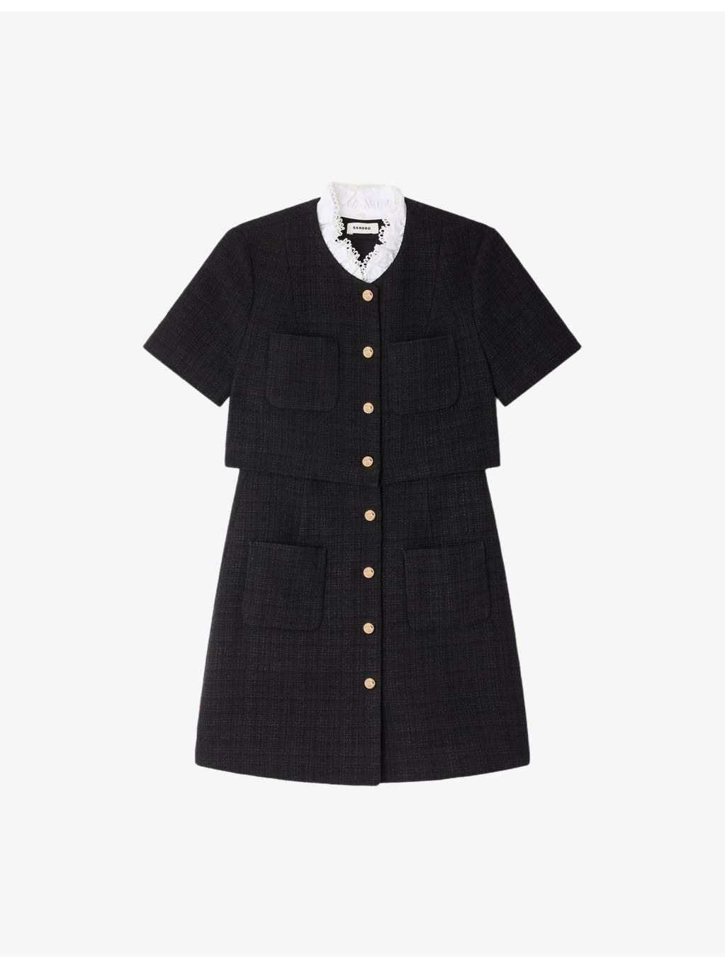 PRODUCT DETAILS - Sandro cotton-blend dress - 49% cotton, 25% viscose, 20% acrylic, 6% polyamide - Exposed button fastening at front - Ruffle detachable collar, patch pockets at the chest, short sleeves, two pockets at the side - Dry clean - True to size - Model is 5ft 9in/1.75m and wears a size UK 8 - Midweight, slight stretch Ref: R04512063