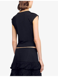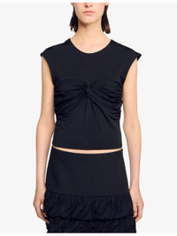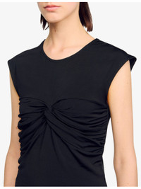 PRODUCT DETAILS - Sandro stretch-woven T-shirt - 97% viscose, 3% elastane - Slips on - Slim fit, round neck, cap sleeves, draped detail - Hand wash cold - True to size - Model is 5ft 9in/1.75m and wears a size UK 8 - Lightweight, slight stretch Ref: R04490531