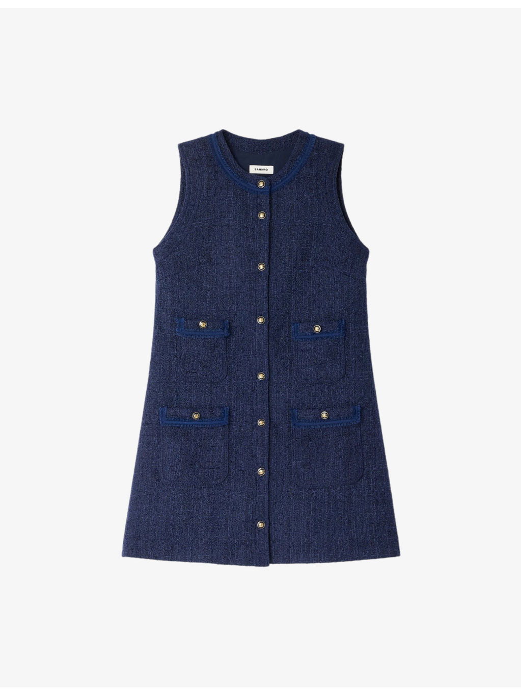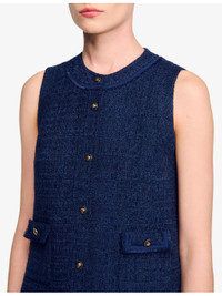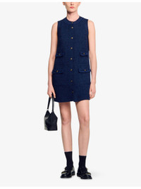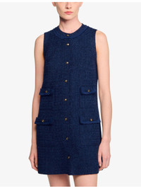 PRODUCT DETAILS - Sandro tweed mini dress - 100% polyester - Round neck, sleeveless, four-buttoned flap pockets at front, gold-toned hardware, mini-length - Dry clean - Made in Tunisia - True to size - Lightweight, non-stretch Ref: R04490671