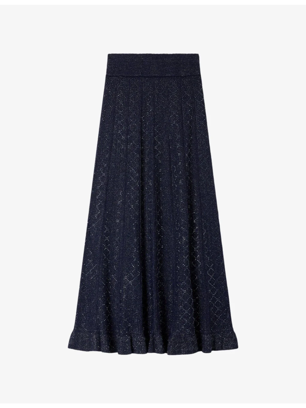PRODUCT DETAILS - Sandro knitted maxi skirt - 68% viscose, 18% polyamide, 9% polyester, 5% metallic fibres; lining 82% viscose, 18% polyamide; belt 68% viscose, 18% polyamide, 9% polyester, 5% metallic fibres; rib 68% viscose, 17% polyamide, 10% polyester, 5% metallic fibres - Regular fit, elasticated waistband, flared silhouette, all-over rhinestone embellishments, all-over textured knit - Hand wash - True to size - Midweight, slight stretch Ref: R04578698