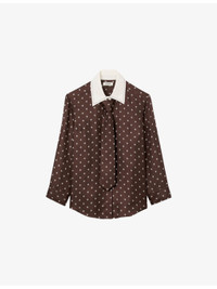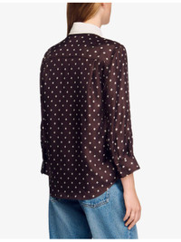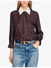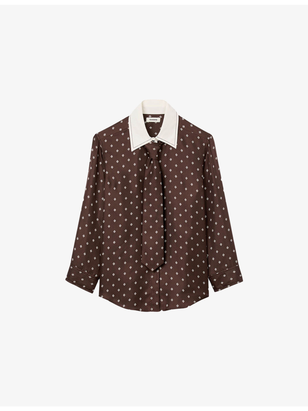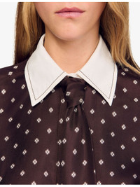 PRODUCT DETAILS - Sandro silk shirt - 100% silk - Button fastening - Loose fit, pointed contrasting collar, long sleeves, buttoned cuffs, removable tie, all-over pattern, asymmetric hem - Dry clean - Made in Tunisia - True to size - Lightweight, non-stretch Ref: R04490678