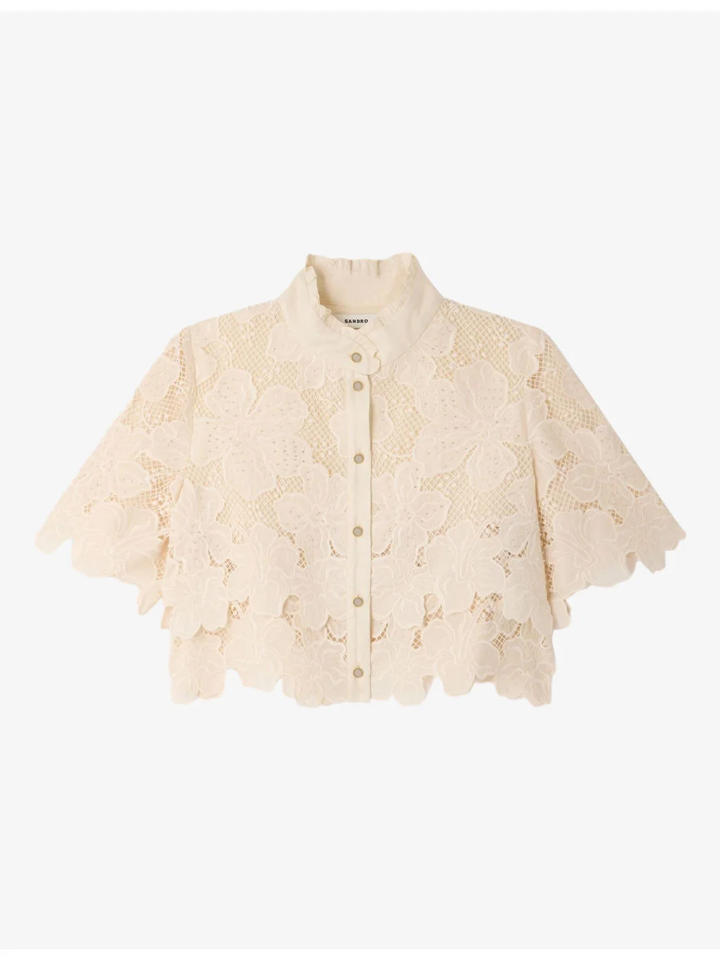 PRODUCT DETAILS - Sandro lace shirt - 66% polyester, 32% cotton, 2% polyamide - Button fastening - Regular fit, standing collar, short sleeves, floral pattern, cropped length - Dry clean - True to size - Model is 5ft 9in/1.75m and wears a size UK 8 - Lightweight, non-stretch Ref: R04598465