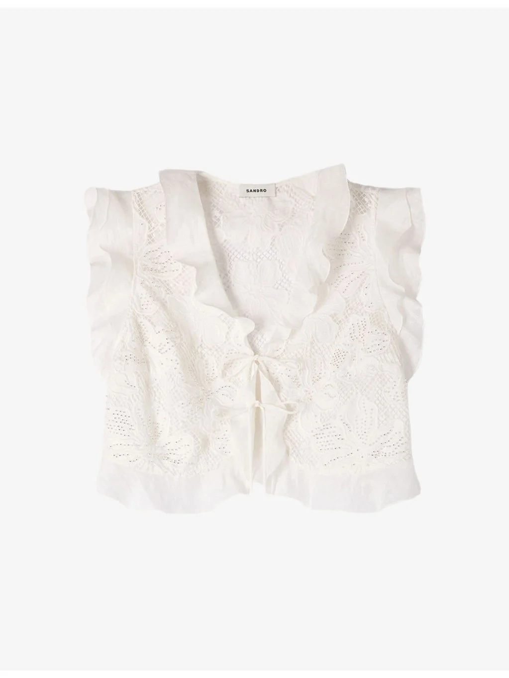 PRODUCT DETAILS - Sandro lace top - 66% polyester, 32% cotton, 2% polyamide - Self-tie fastening - Regular fit, V-neck, sleeveless, ruffle trim, floral pattern, guipure lace, cropped - Dry clean - True to size - Model is 5ft 9in/1.75m and wears a size UK 8 - Lightweight, non-stretch Ref: R04598498