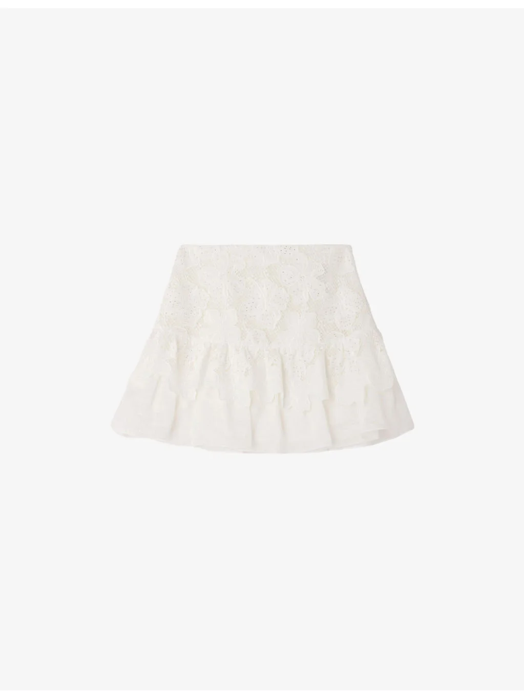 PRODUCT DETAILS - Sandro lace mini skirt - 68% polyester, 32% cotton - Zip fastening - Regular fit, mid-rise, flared, floral pattern, guipure lace - Dry clean - True to size - Model is 5ft 9in/1.75m and wears a size UK 8 - Lightweight, non-stretch Ref: R04598503